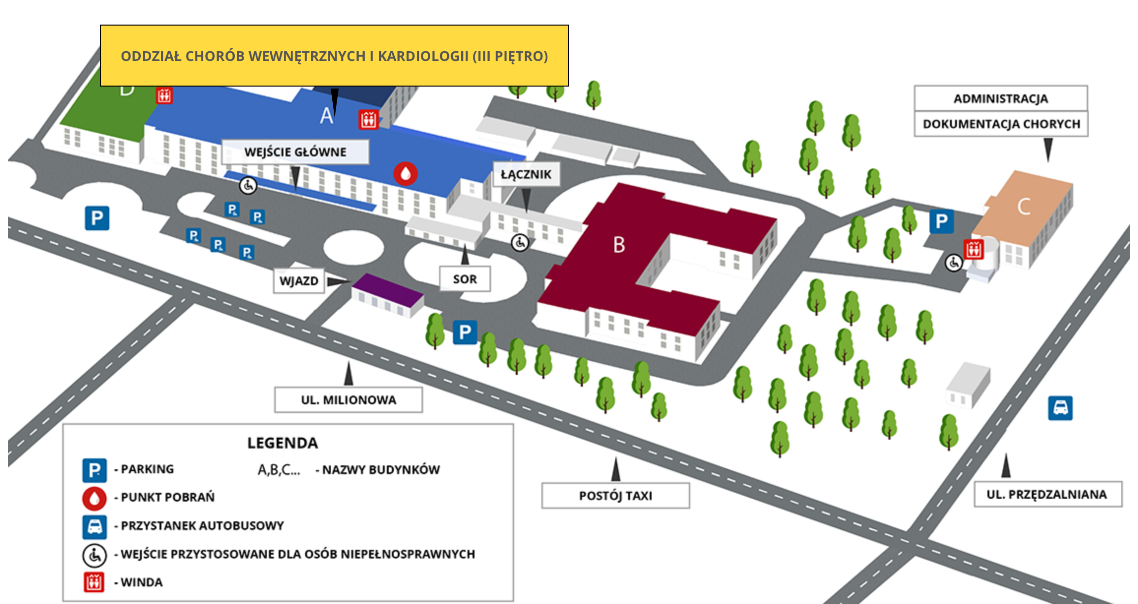 Izba Przyjęć, SOR, Poradnie Specjalistyczne, Oddział Chirurgiczny Ogólny, Oddział Chirurgii Urazowo Ortopedycznej, Oddział Chorób Wewnętrznych i Kardiologii, Oddział Ginekologii Operacyjnej i Zachowawczej